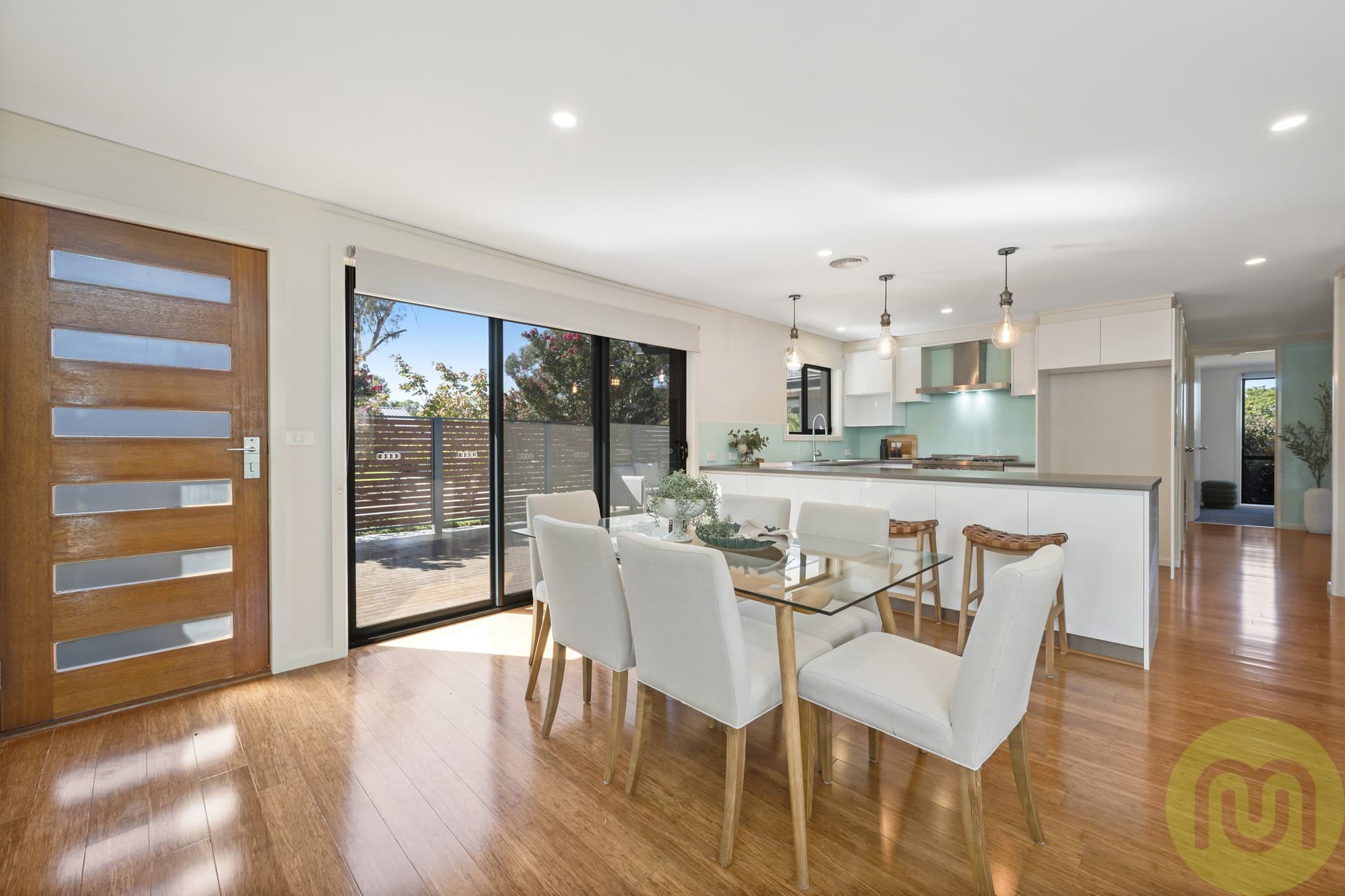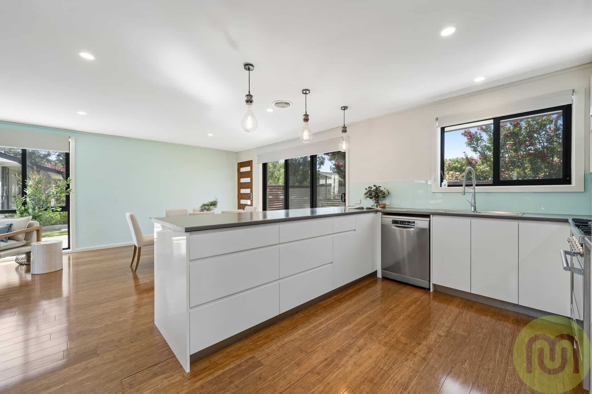 At the heart of the home is the open plan kitchen, lounge and dining area. The true hub for everyday living and entertaining. The renovated kitchen is sure to impress with its sleek, contemporary design, featuring a freestanding oven and gas cooktop, striking glass splashback and an abundance of cupboard and bench space. Pendant lighting over the peninsula bench adds a stylish touch, making it as functional as it is visually appealing.
